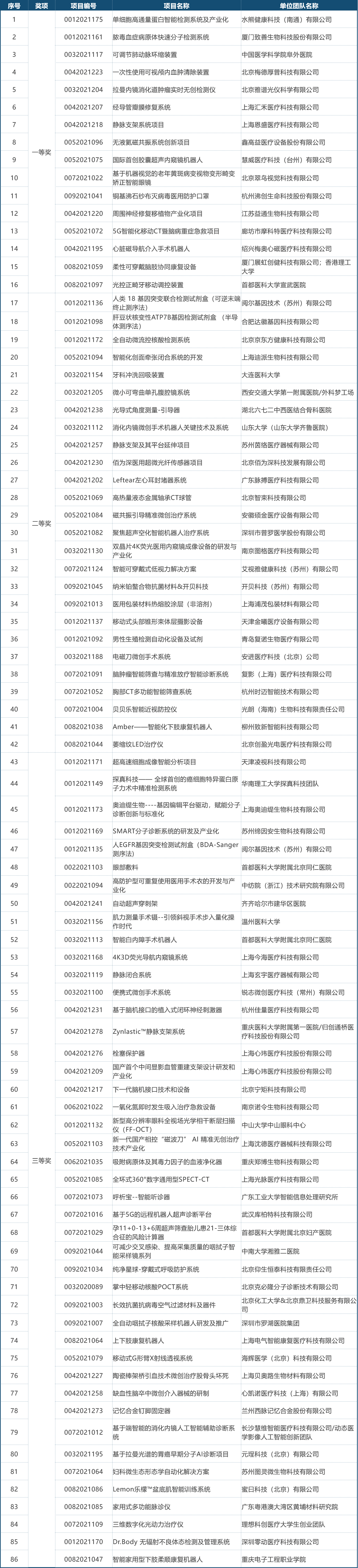 第四届(2021)中国医疗器械创新网创业大赛决赛获奖名单